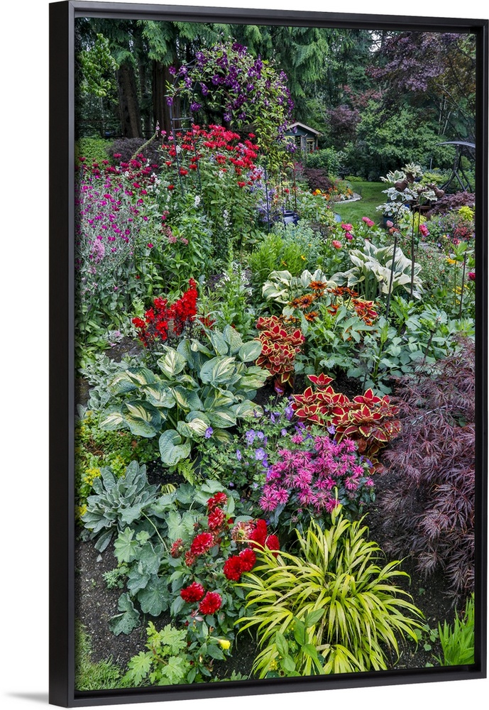 <p>USA, Washington State, Sammamish. Summer perennial flower garden with cone flowers, zinnias. Beebalms, Rebecca. Coleus, Japanese grasses and lawn art.</p>