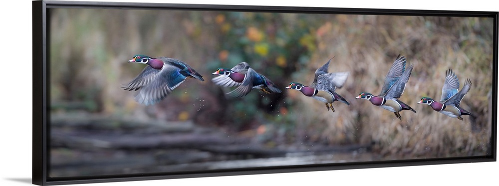 <p>USA. Washington State. Sequence flight of an adult male Wood Duck (Aix sponsa) over a marsh. Digital composite.</p>