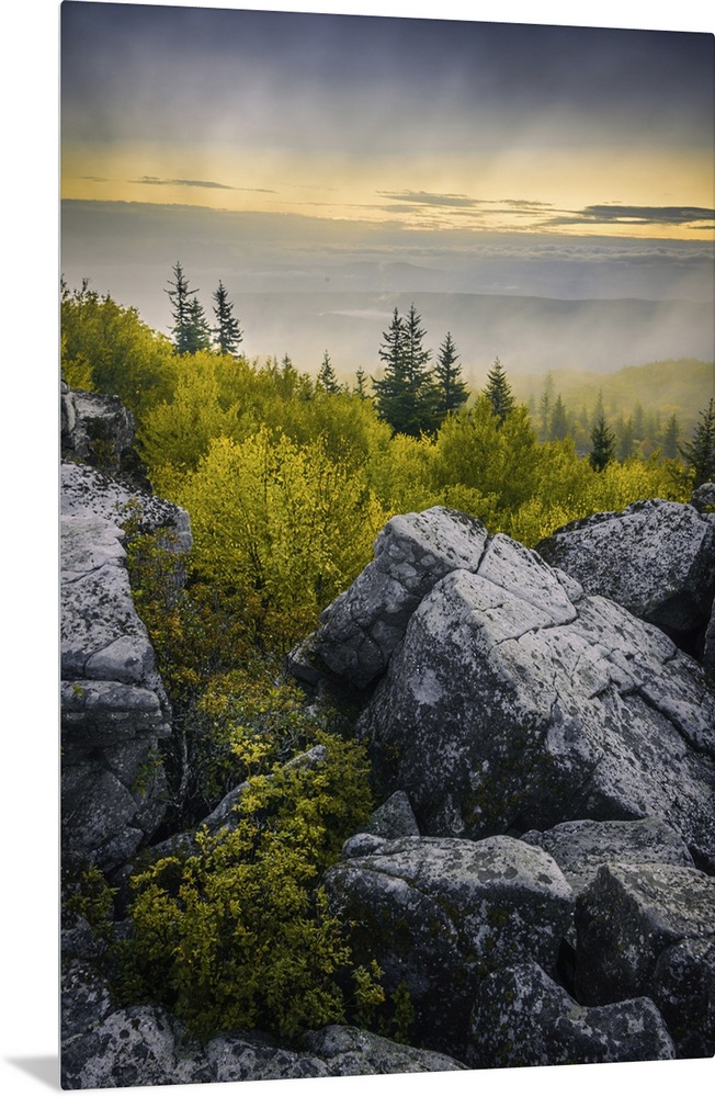 <p>USA, West Virginia, Dolly Sods Wilderness Area. Sunrise on mountain boulders and forest.</p>