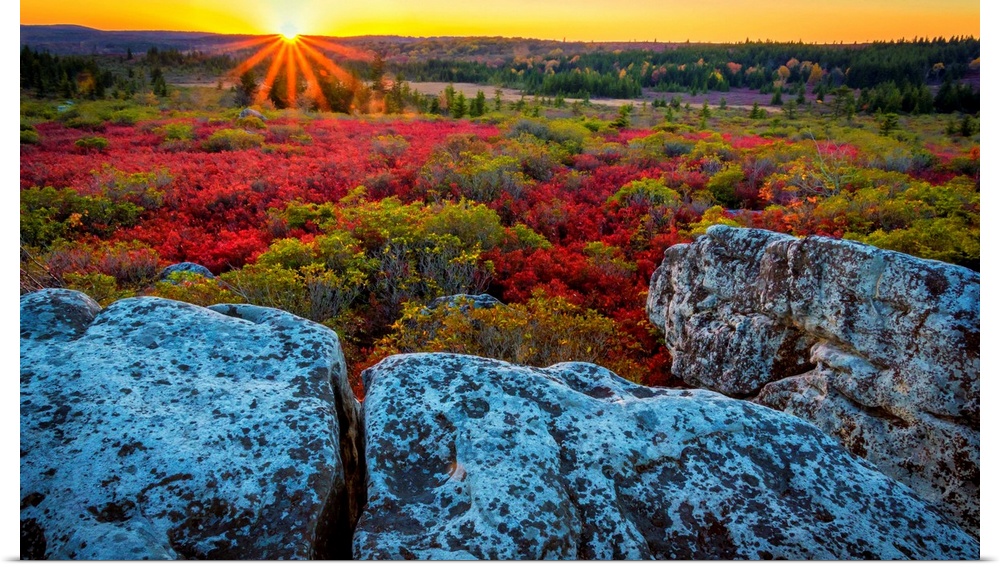 <p>USA, West Virginia, Dolly Sods Wilderness Area. Sunset on tundra and rocks.</p>