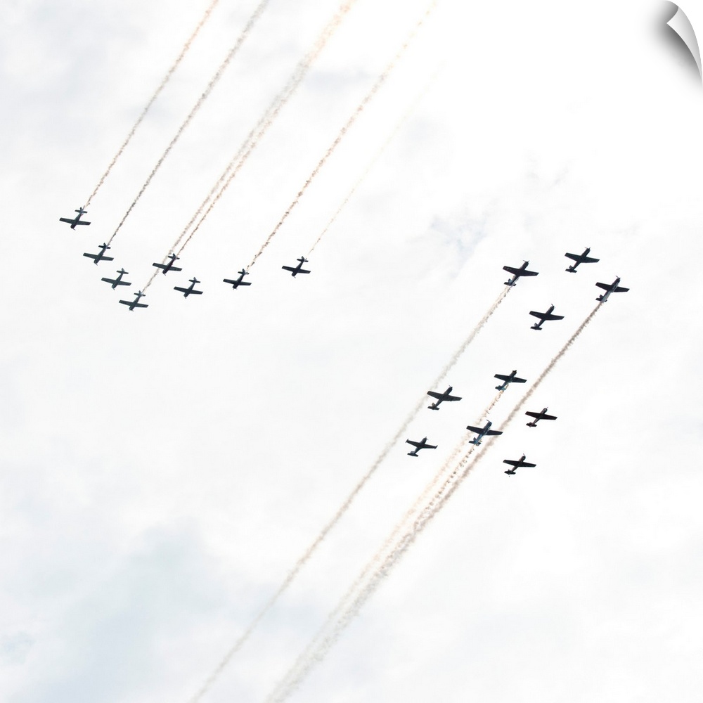 <p>North America, USA, Wisconsin, Oshkosh, AirVenture 2016, Formations of T-28 Trojans and Nanchang CJ-6A Aircraft Trailing smoke in head-on pass</p>