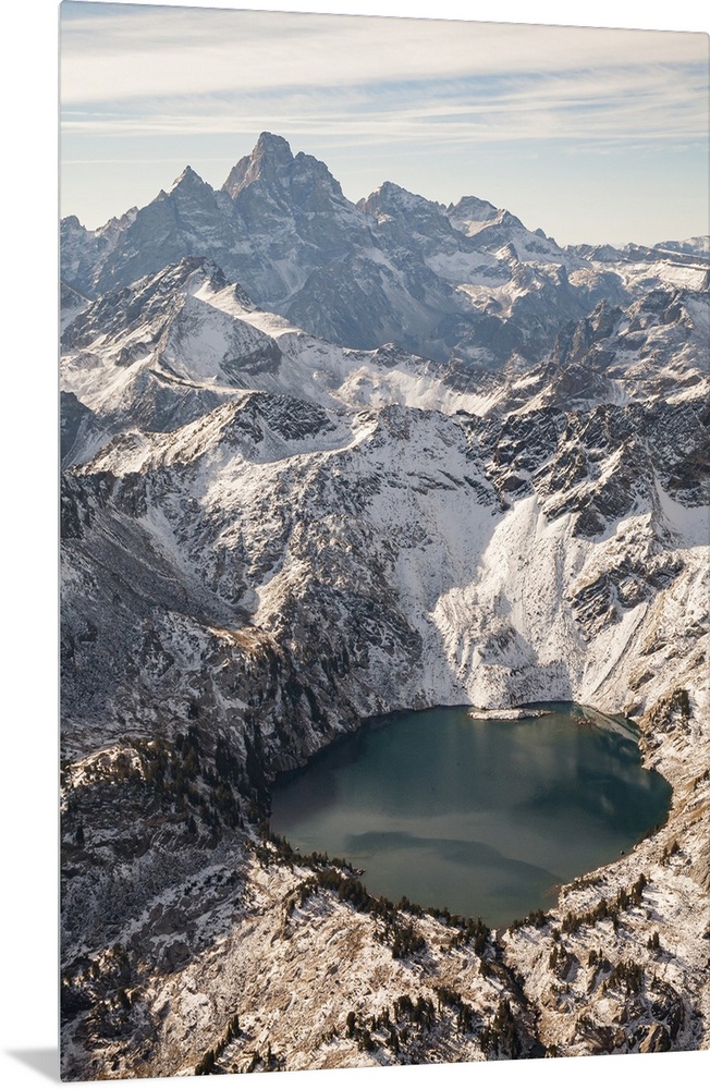<p>USA, Wyoming, Grand Teton National Park. Aerial of high mountain lake and Teton Range.</p>