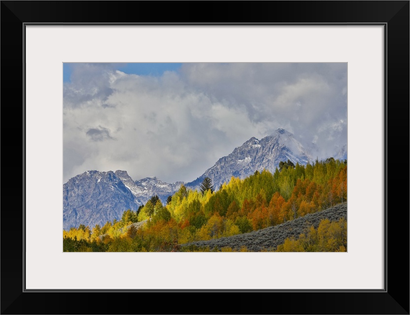 <p>USA, Wyoming. Grand Tetons National Park near Oxbow Bend on the Snake River with Fall colored Aspen grove and backdrop Teton Mountains coming through low clouds.</p>