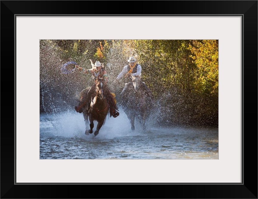 <p>USA, Wyoming, Shell, The Hideout Ranch, Cowboy and Cowgirl on Horseback Running through the River (MR/PR)</p>