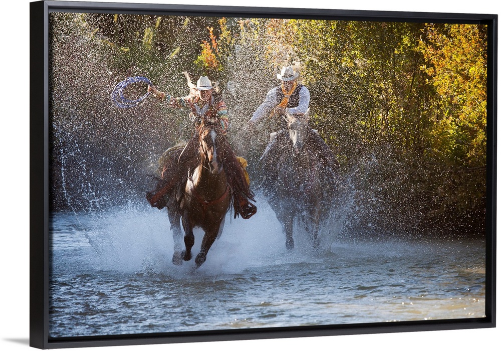 <p>USA, Wyoming, Shell, The Hideout Ranch, Cowboy and Cowgirl on Horseback Running through the River (MR/PR)</p>