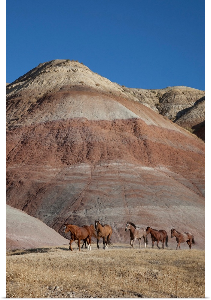<p>USA, Wyoming, Shell, The Hideout Ranch, Horses Walking in front of Painted Hills (MR/PR)</p>