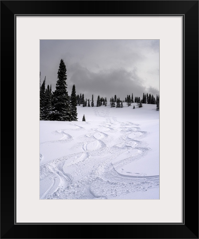 <p>USA, Wyoming. Ski tracks in powder near Jackson Hole.</p>
