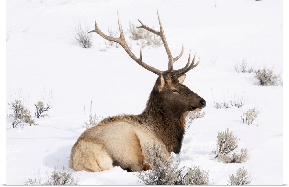 <p>USA, Wyoming, Yellowstone National Park. A bull elk rests in the snow with his antlers still intact for now.</p>