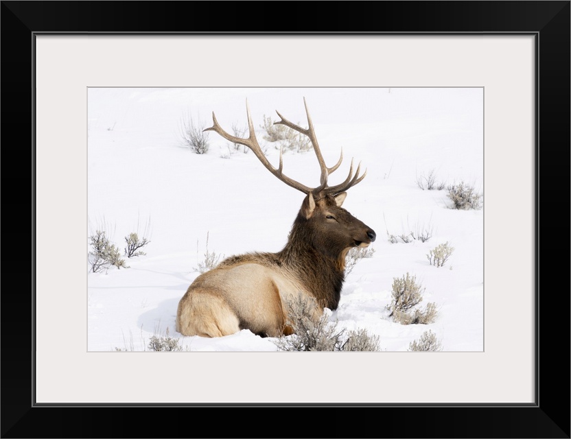 <p>USA, Wyoming, Yellowstone National Park. A bull elk rests in the snow with his antlers still intact for now.</p>