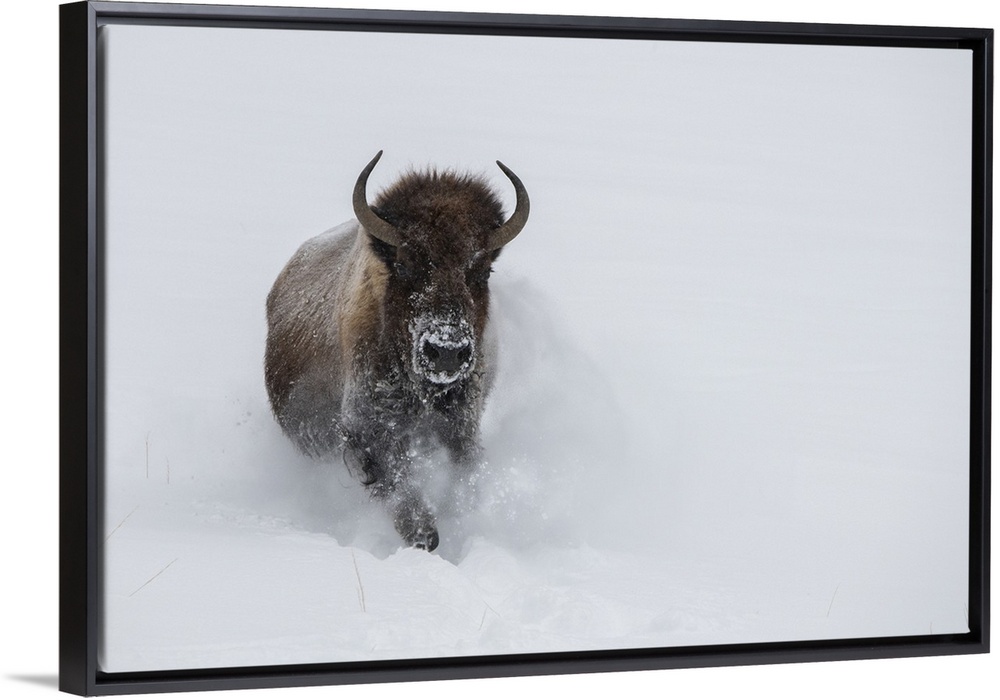<p>USA, Wyoming, Yellowstone National Park. Lone bull bison running in deep snow. United States, Wyoming.</p>