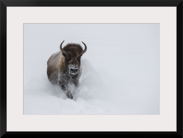 <p>USA, Wyoming, Yellowstone National Park. Lone bull bison running in deep snow. United States, Wyoming.</p>