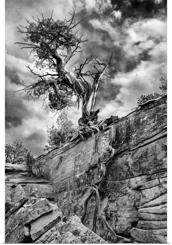 <p>North America, USA, Utah. Black and white image of Desert Juniper tree (Juniperus osteosperma) growing out of a canyon wall, Cedar Mesa, UT</p>
