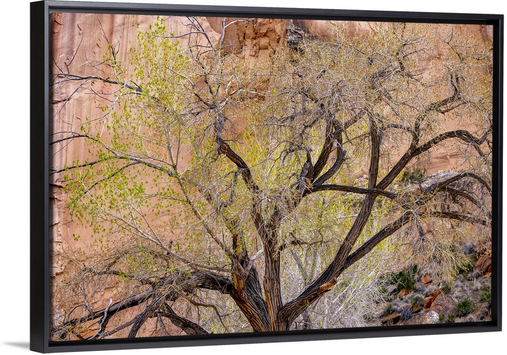 <p>A cottonwood grows at the base of a sandstone cliff wall, Utah</p>