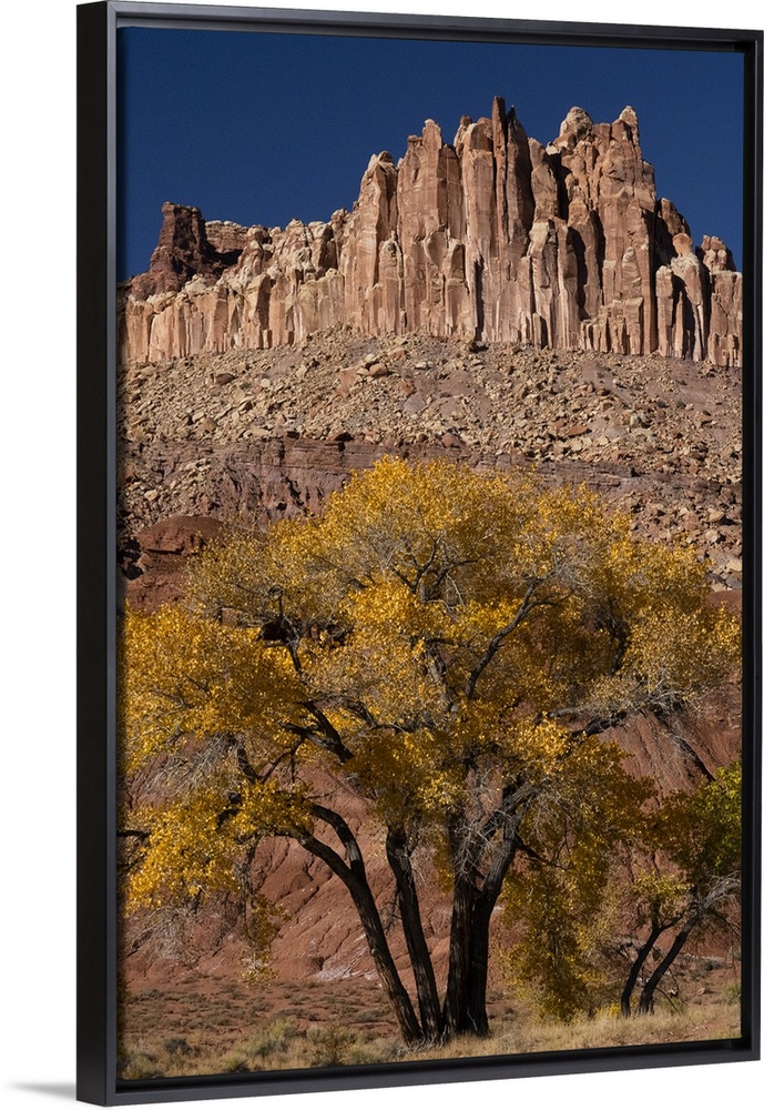 <p>USA, Utah. The Castle, geological features and autumn foliage, Capitol Reef National Park.</p>