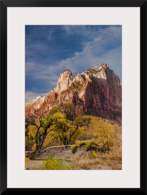 <p>North America, USA, Utah, Zion National Park. Autumn foliage in front of the Sentinel in Zion National Park, UT</p>