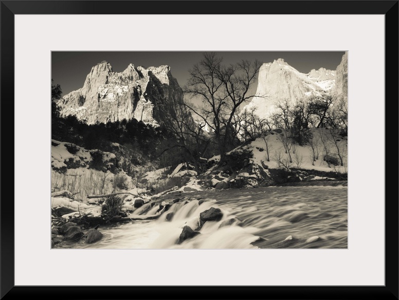 <p>USA, Utah, Zion National Park, Mountain Sunrise by the North Fork Virgin River. winter</p>