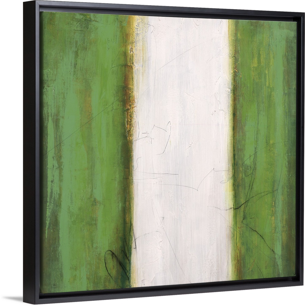 <p>Abstract painting using green stripes on the left and right sides of the image, with a white stripe in the center.</p>