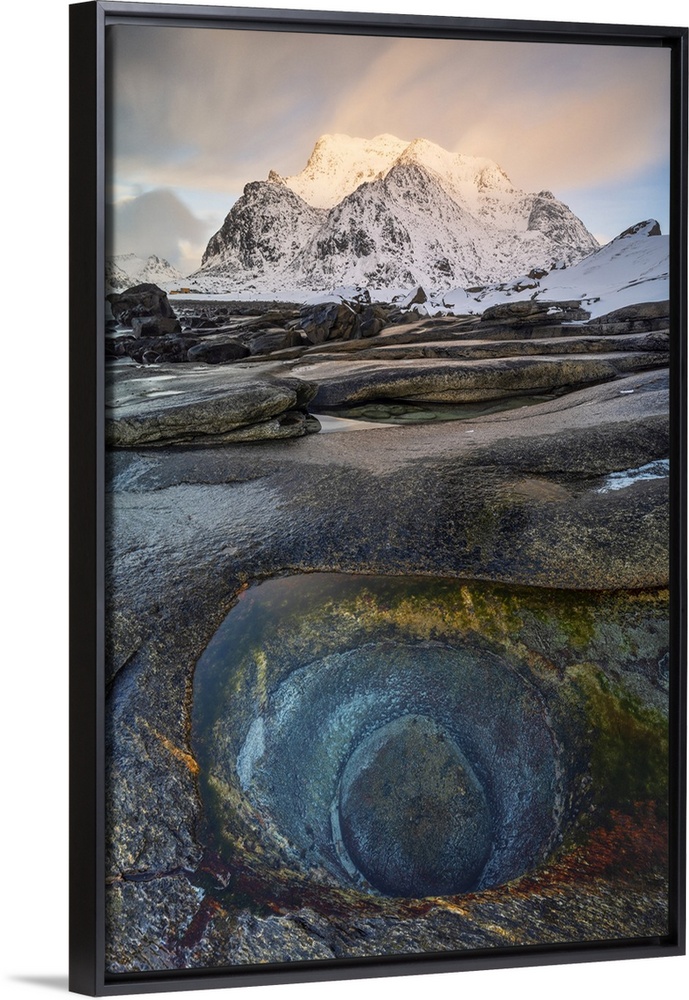 <p>Uttakleiv beach with a famous eye of dragon in foreground, Vestvagoy, Lofoten island, Norway.</p>