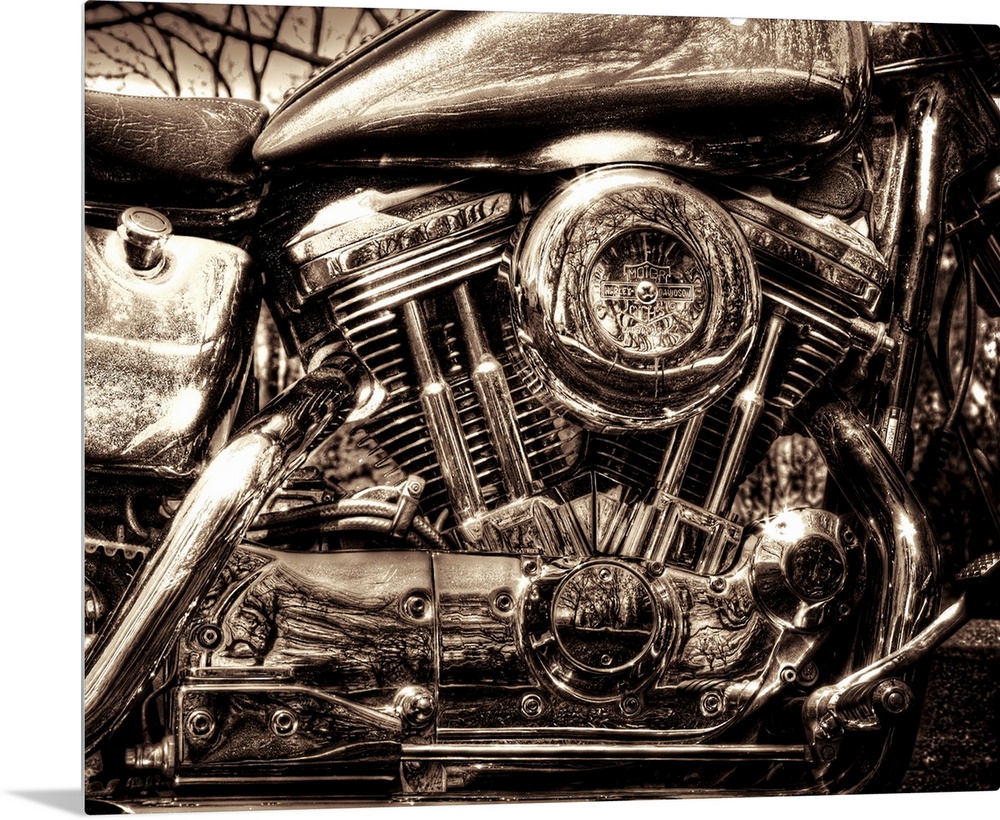 <p>Up-close photograph of engine of Harley Davidson motorcycle.</p>