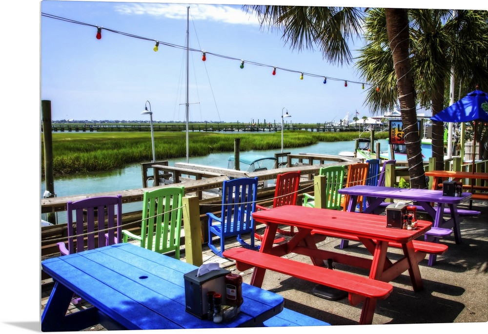 <p>Brightly painted rocking chairs and picnic tables on a deck in South Carolina.</p>