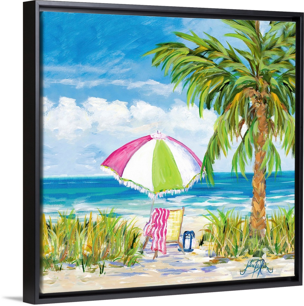 <p>Square painting of a relaxing beach scene with a chair and a colorful umbrella set up next to a palm tree and beach grass, right in front of the blue ocean.</p>