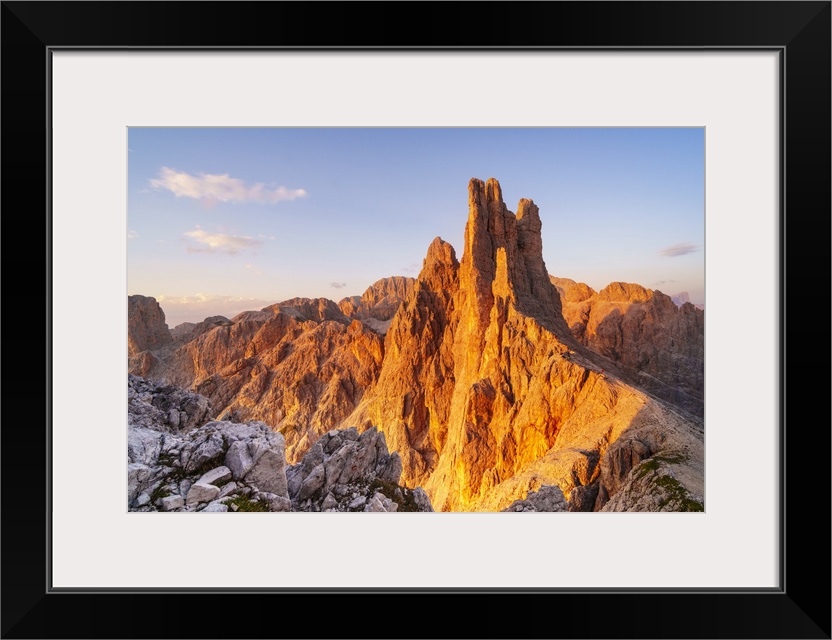 <p>Vajolet towers at sunset in Catinaccio group of Dolomites. Re Alberto refuge in Catinaccio group. Gardeccia, Pozza di Fassa, Fassa valley, Trento district, Dolomites, Trentino Alto Adige, Italy</p>