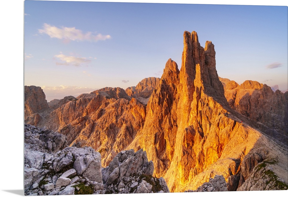 <p>Vajolet towers at sunset in Catinaccio group of Dolomites. Re Alberto refuge in Catinaccio group. Gardeccia, Pozza di Fassa, Fassa valley, Trento district, Dolomites, Trentino Alto Adige, Italy</p>
