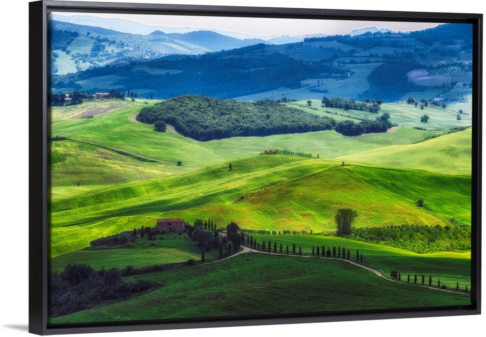 <p>Rolling hills with farms, Val d'Orcia, Tuscany, Italy.</p>