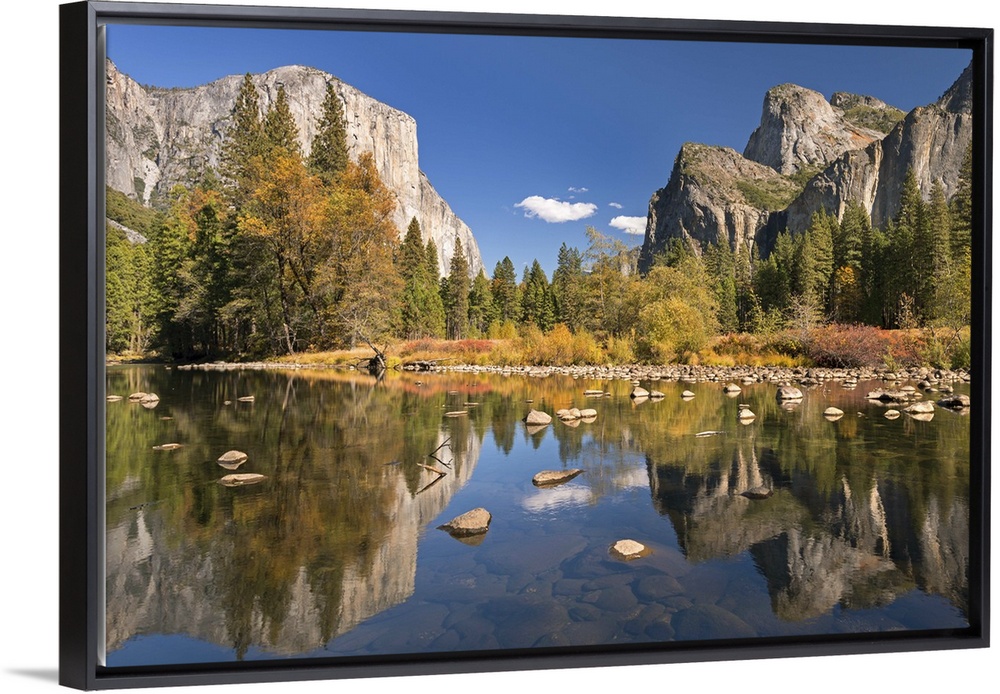 <p>El Capitan and Bridalveil Falls in Yosemite reflected in the clear water of the River Merced.</p>