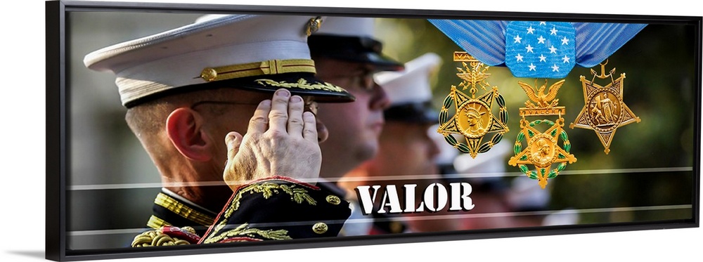 <p>Panoramic photograph of a Marine saluting with three medals on the side and "Valor" written across the bottom in white.</p>