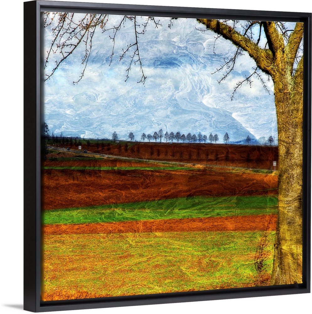 <p>Square, large, fine art wall hanging of a big tree in the foreground, against a landscape of alternating grasses and dirt, a line of trees beneath a blue sky on the horizon. The entire image has a textured, swirling effect.</p>