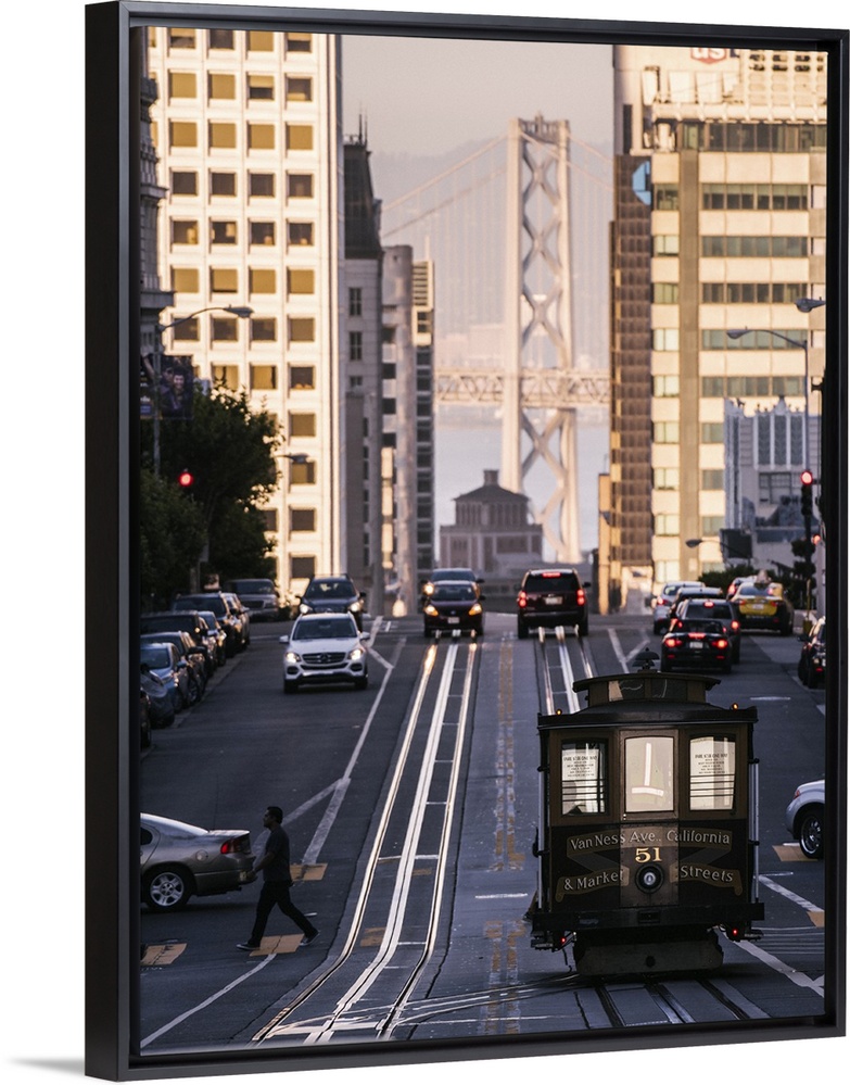 <p>Photograph of the Van Ness Ave. and Market Streets Trolley with the Bay Bridge in the background.</p>