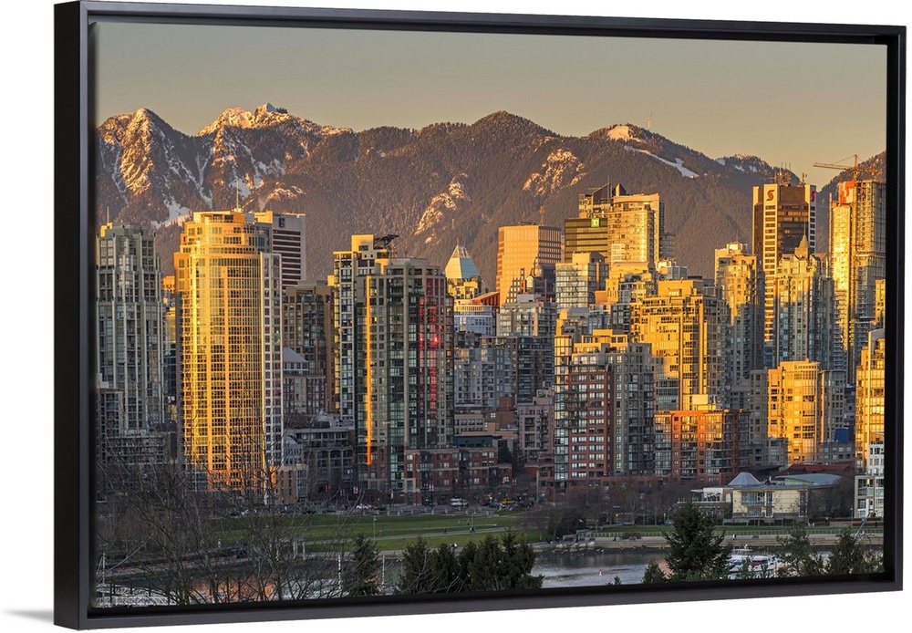 <p>Downtown skyline with snowy mountains behind at sunset, Vancouver, British Columbia, Canada.</p>