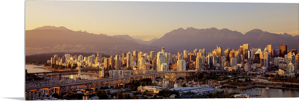 <p>Cityscape panorama of Vancouver Canada with the harbor and bridges in the foreground going to Vancouver Island and the Canadian Rocky Mountains in the background.</p>