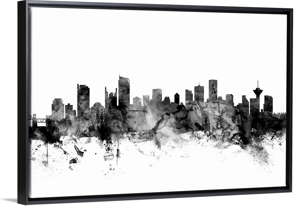 <p>Contemporary artwork of the Vancouver city skyline in black watercolor paint splashes.</p>