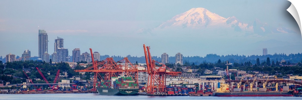 <p>View of Vancouver harbor, Metrotown and Mount Baker in Vancouver, British Columbia, Canada.</p>
