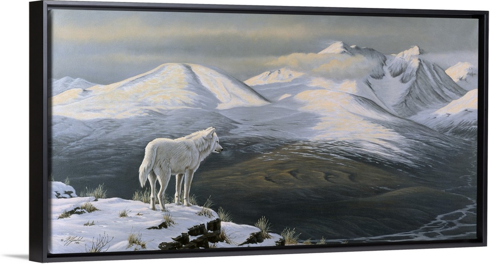 <p>Arctic wolf standing on a cliff looking out over a snowy mountain valley.</p>
