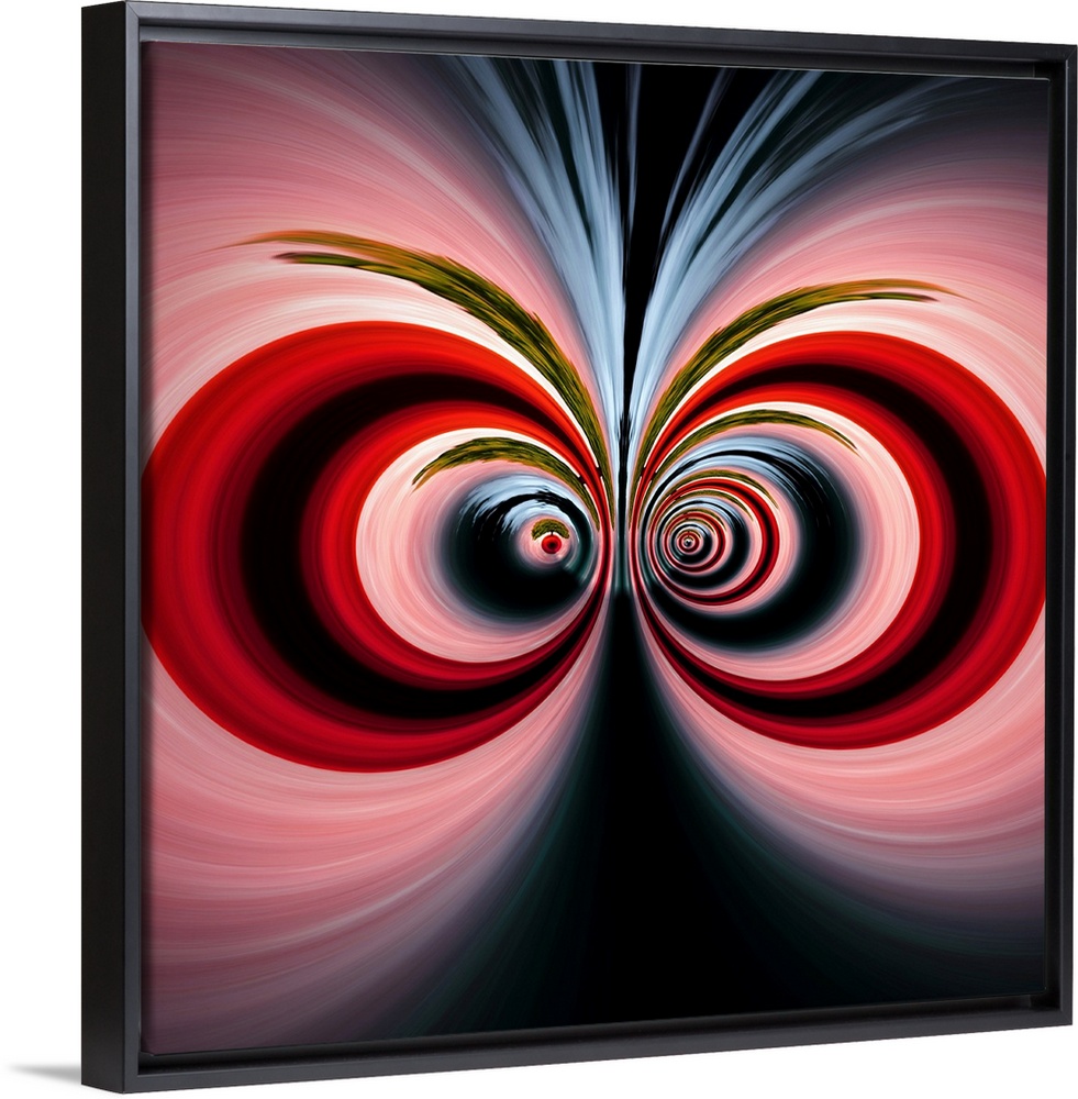 <p>Reflecting circular figures in shades of pink, red, black, and gold resembling two eyes.</p>
