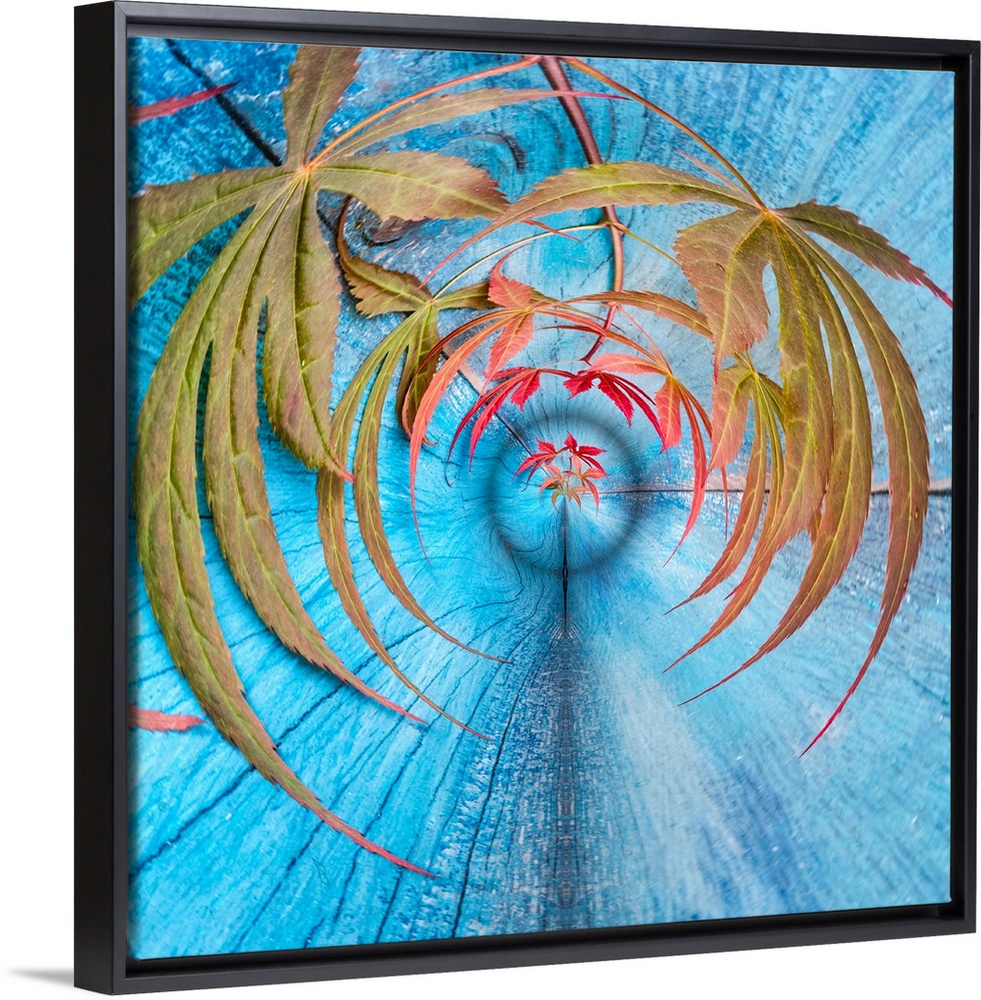<p>Conceptual square photograph of maple leaves and blue wood grain wrapped in a circular form.</p>