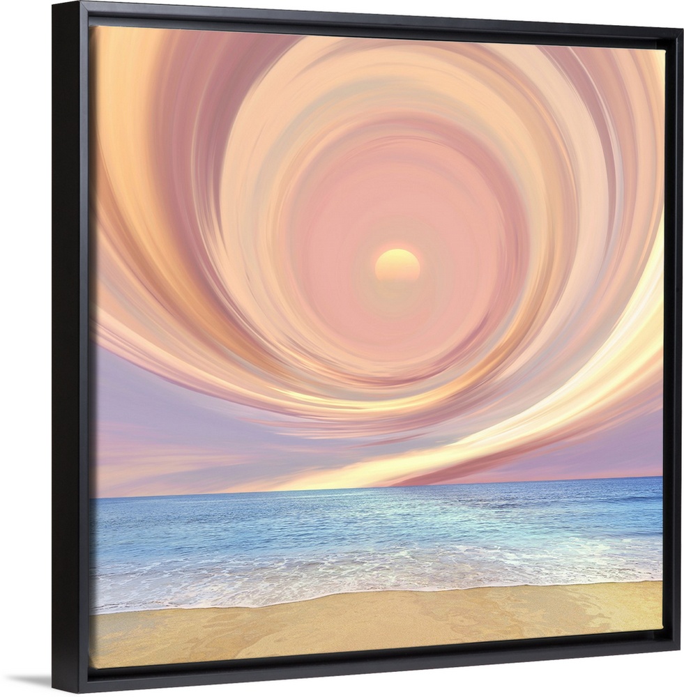 <p>Conceptual photograph of a pink spiraled circle in the sky above the ocean and beach.</p>