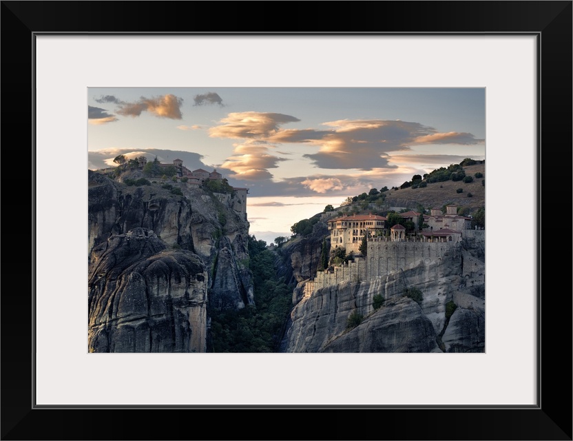 <p>Sunset light on clouds and Varlaam and Megalo Meteoro Monasteries, Meteora, UNESCO World Heritage Site, Thessaly, Greece, Europe</p>