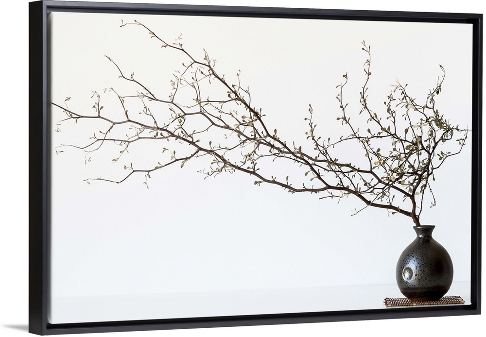 <p>Still life photography of a branch with several small flowers in a round vase.</p>