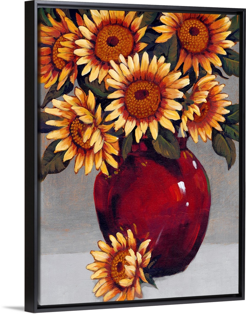 <p>A painting of vibrant yellow sunflowers sitting in a deep red vase against a gray background.</p>