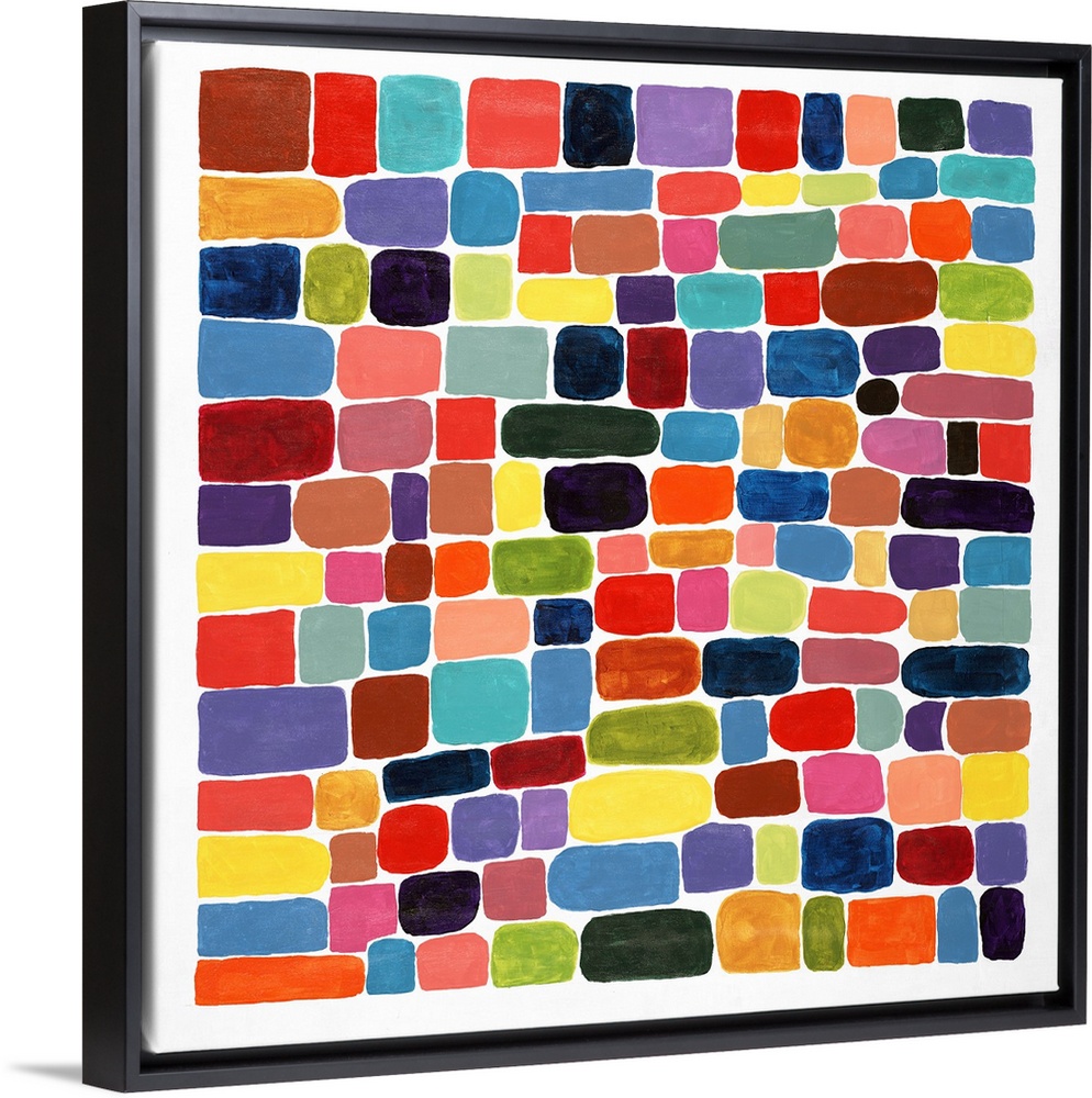 <p>Contemporary abstract painting of brightly colored shapes making a mosaic.</p>