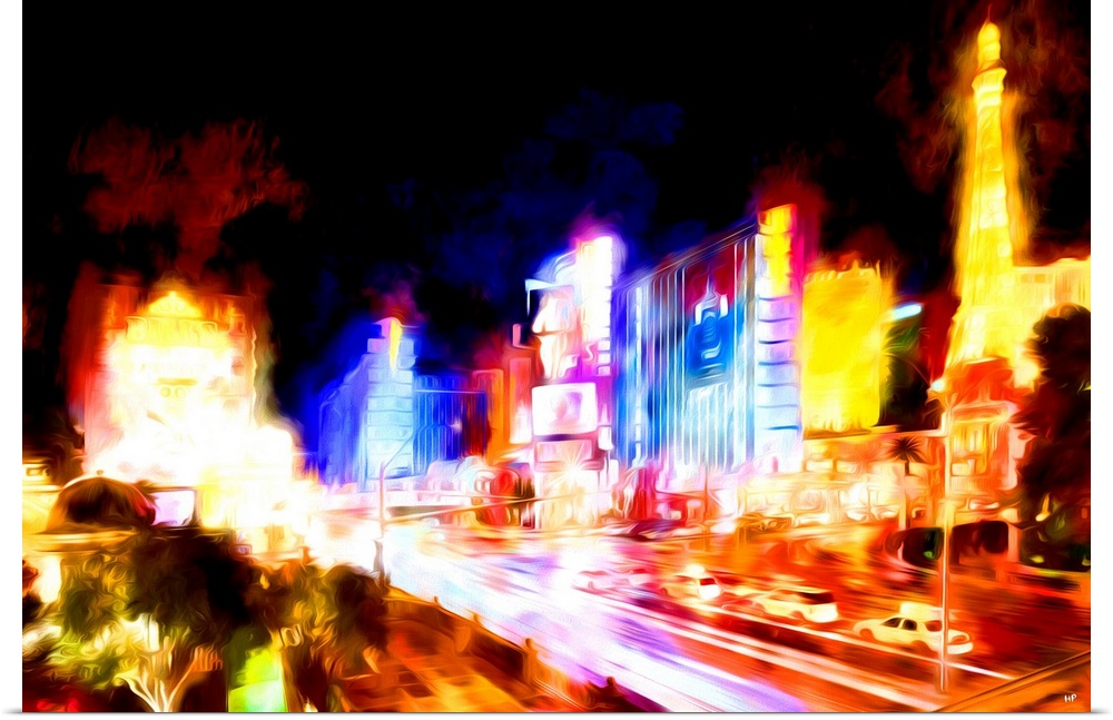 <p>Photograph with a painterly effect of Las Vegas lit up at night.</p>