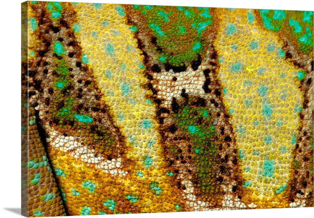 <p>Veiled chameleon skin. Close-up of the skin of a veiled chameleon (Chamaeleo calyptratus). The veiled chameleon is native to the Arabian Peninsula, in Yemen and Saudi Arabia.</p>