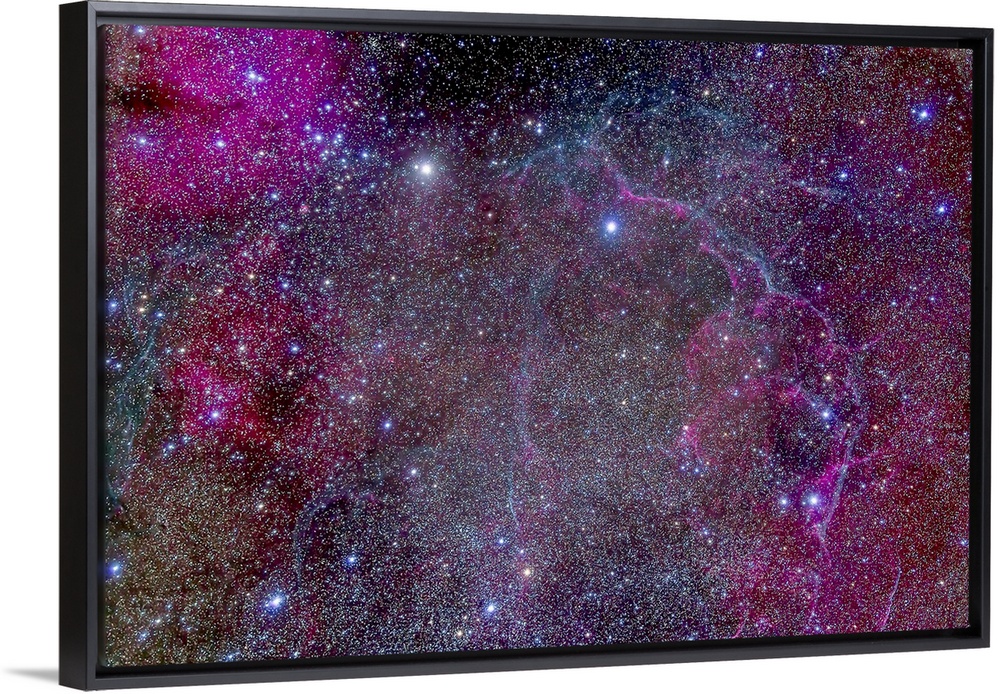 <p>The Vela supernova remnant in the centre of the Gum Nebula area of Vela. This is the remains of a star that exploded thousands of years ago. The emission nebula at upper left is Gum 17, at centre left is Gum 18..</p>