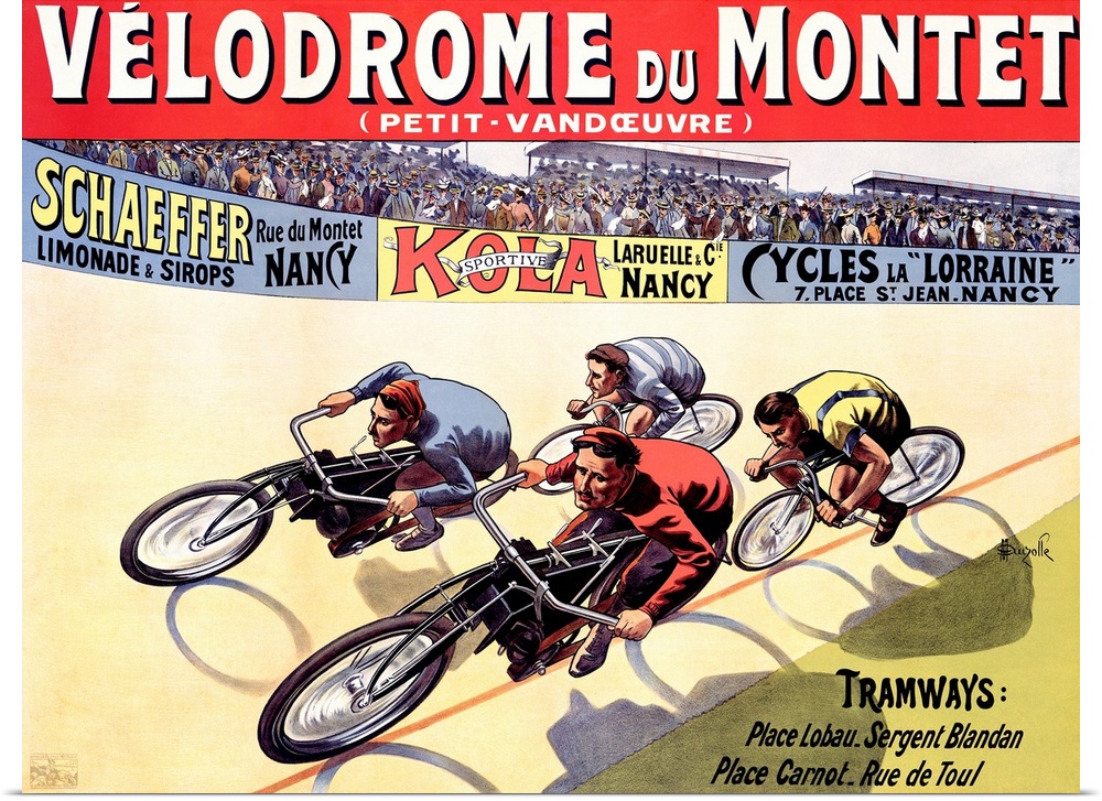 <p>Old advertising poster with cyclists on vintage bikes circling a raceway lined with stands full of people.</p>