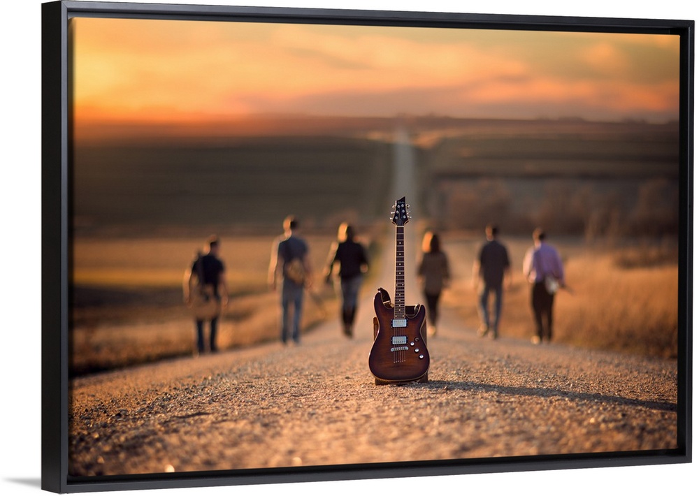 <p>A group of musicians walk down a gravel road, with an electric guitar in the foreground.</p>