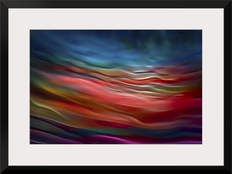 <p>Abstract photograph in blue and red shades resembling ocean waves.</p>